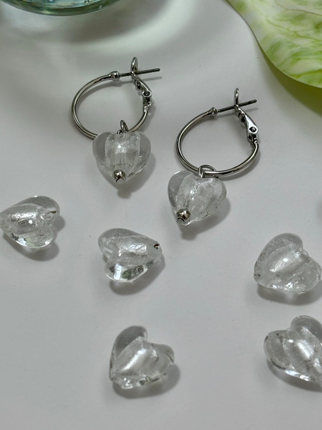 透き通るガラス素材で仕上げられた小ぶりなハートです。 シンプルながらも、その透明感が一際目を引き、あなたのスタイルに優雅さをプラスしてくれます。 取り外しもできるので、シンプルなフープのみでお使い頂けます! 素材:ガラス