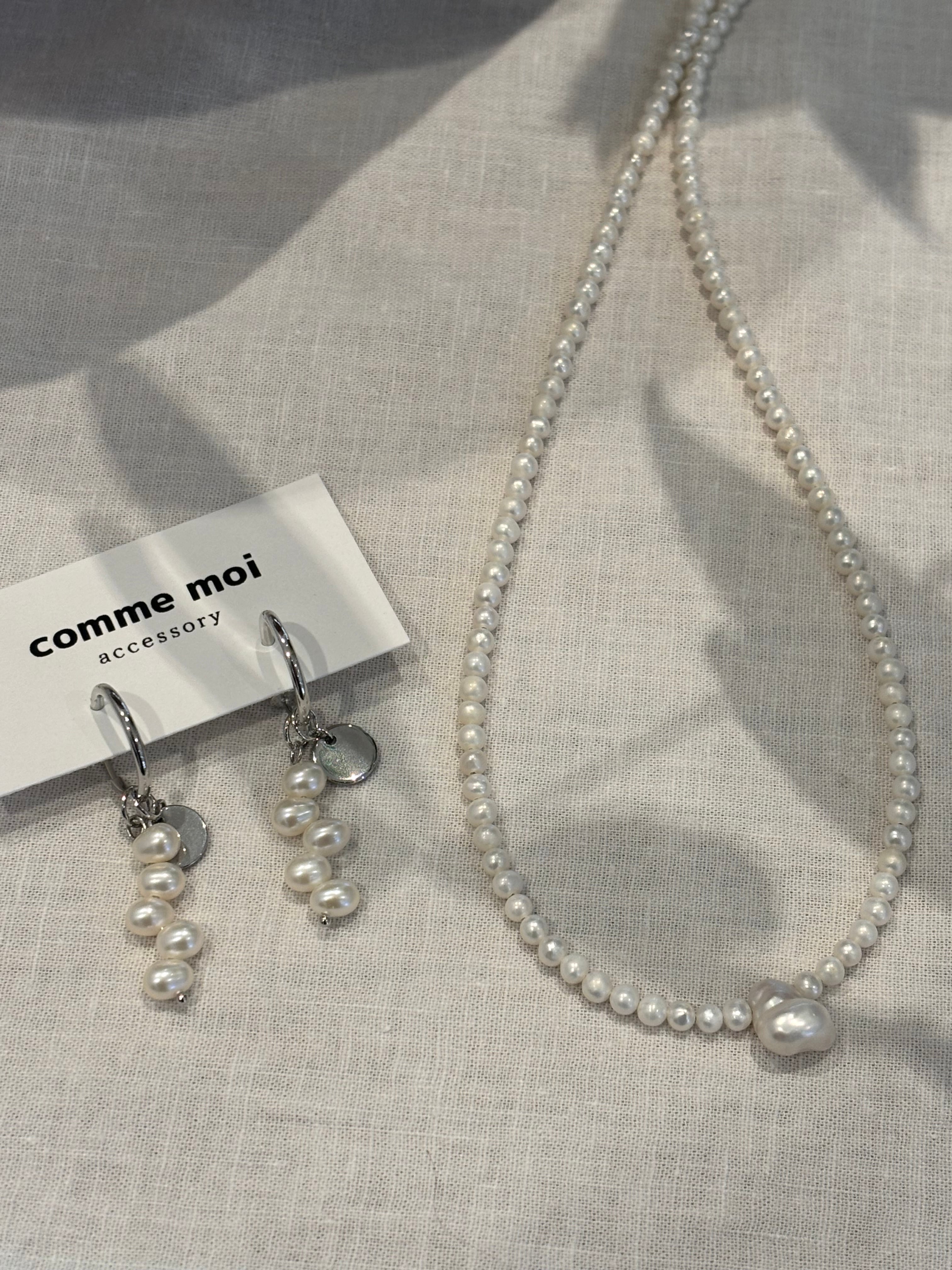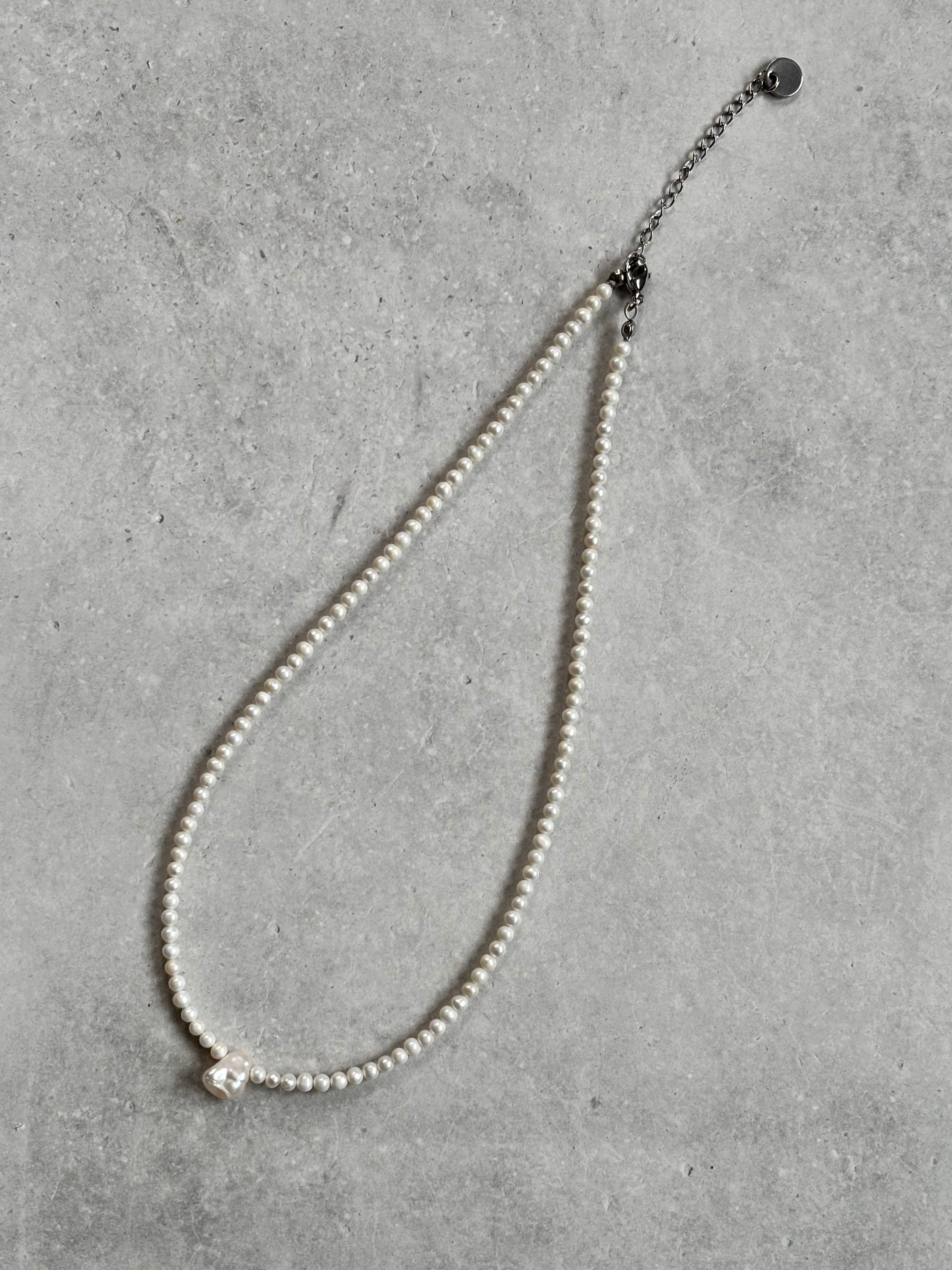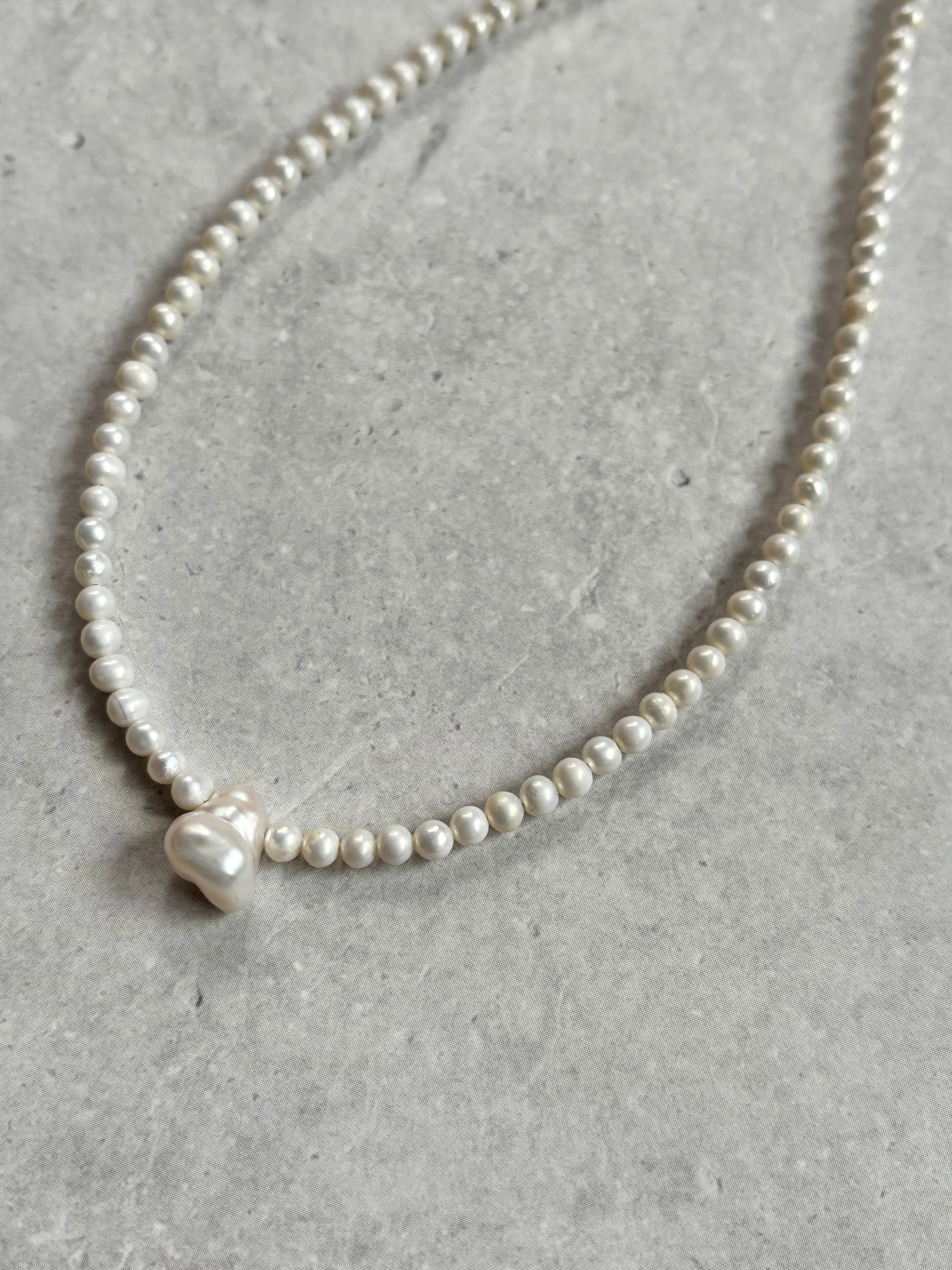 小粒のパールの中に、変わり型のパールがほんのりアクセントとなるネックレス。