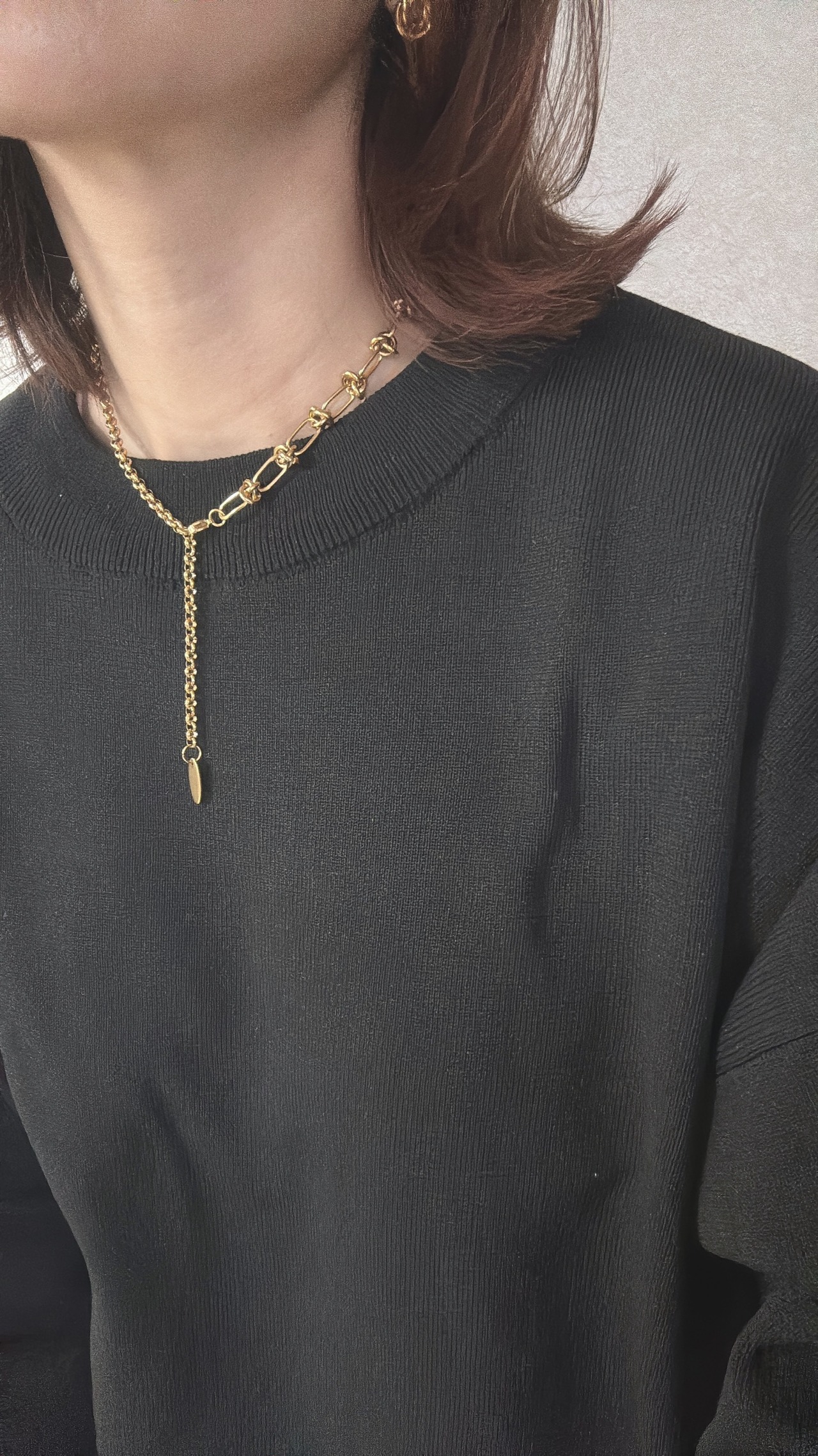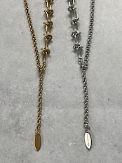 異なった2種類のネックレスを組みあわせたショートネックレス。